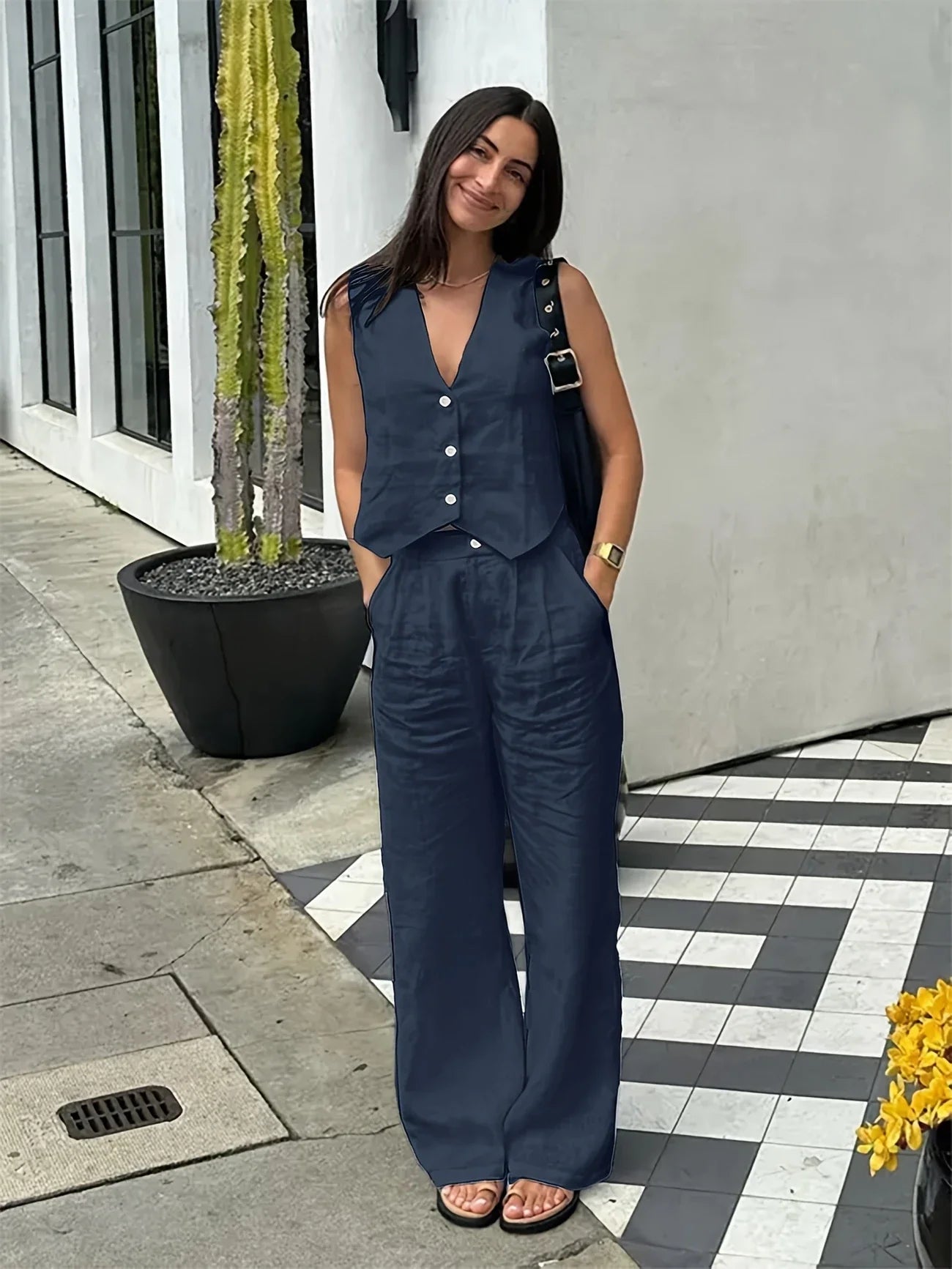 ✅Flattering Silhouette: The tailored vest cinches gently at the waist while the relaxed-fit pants provide a graceful drape. This combination enhances your natural shape and delivers a flattering, elongated silhouette.