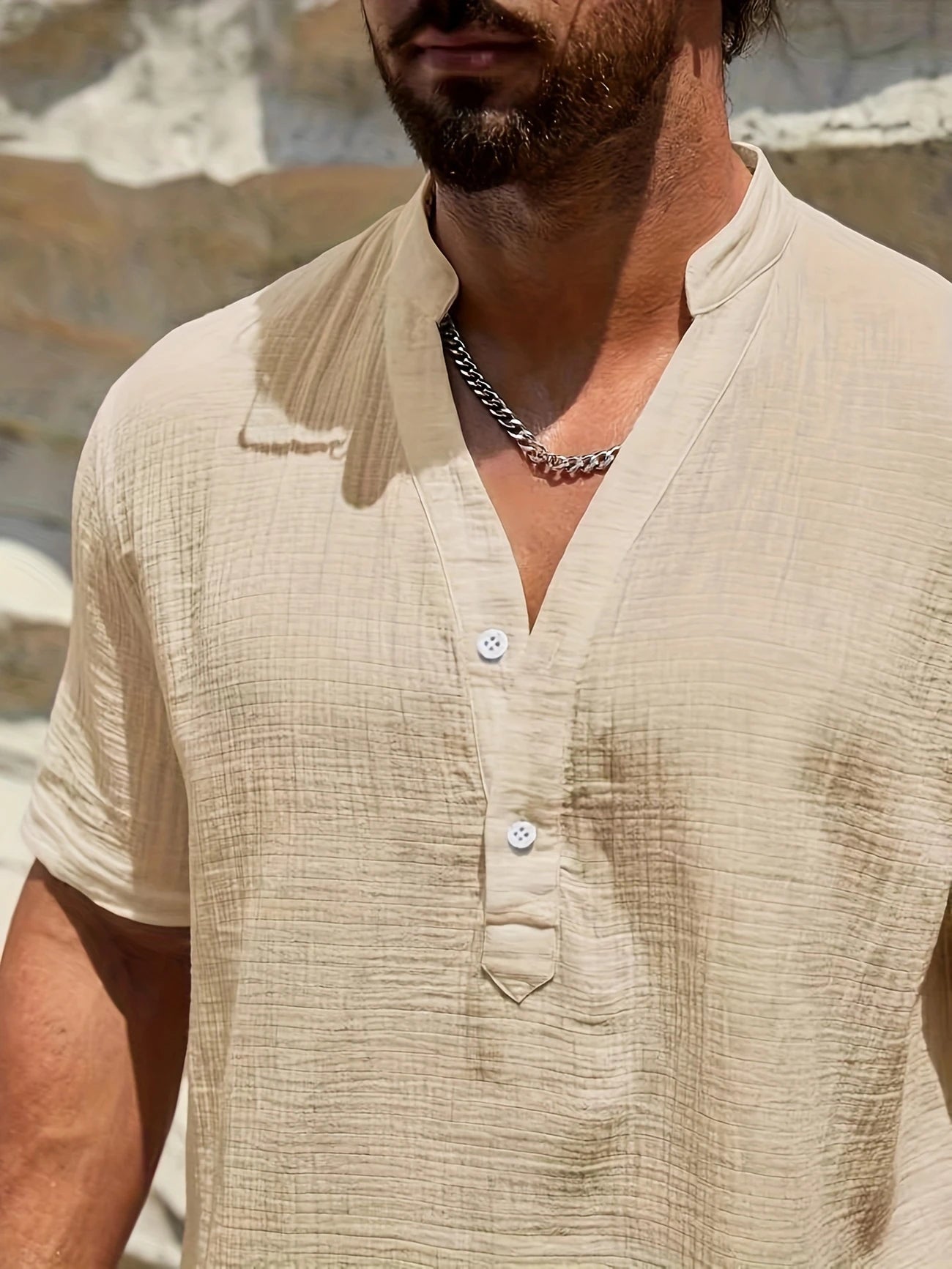 ✅Stylishly Minimal Design: The Sancho shirt combines a sleek mandarin stand collar with a half-placket button-up front for a refined, minimalist look. It’s ideal for summer events, beach outings, or casual meet-ups where style meets ease.